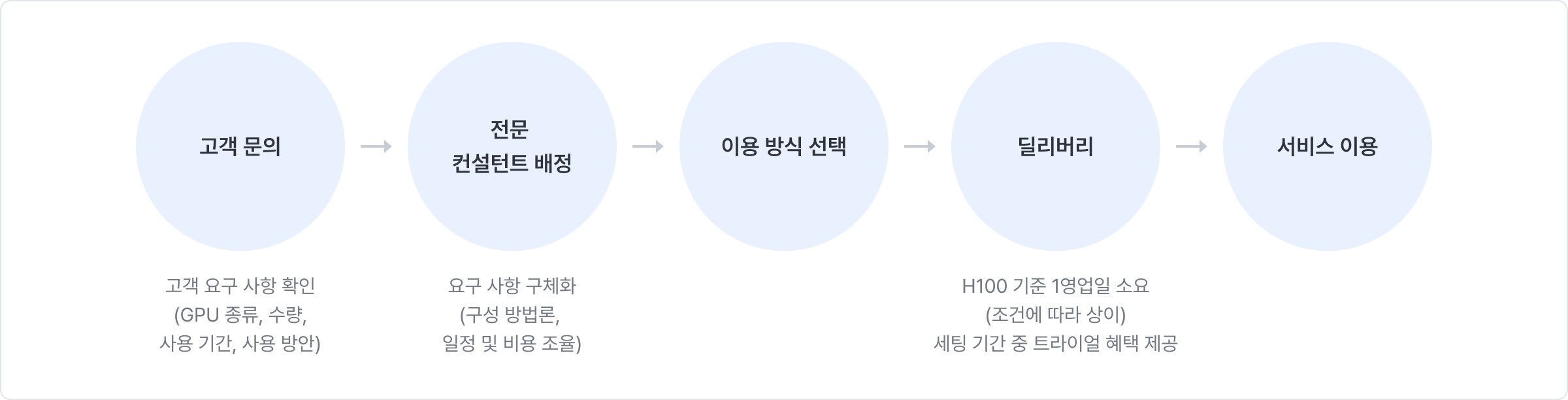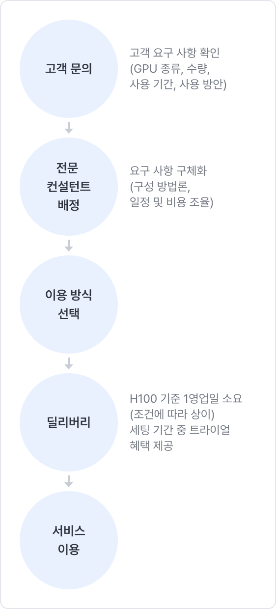 NHN Cloud의 GPU는 아래와 같은 절차로 도입됩니다. 모든 과정은 NHN Cloud의 IT 전문가가 함께합니다.